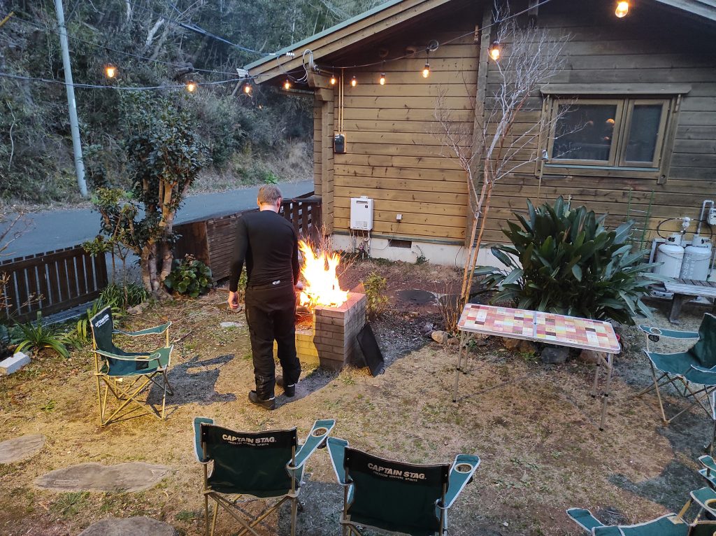 Also musste erst mal Feuer gemacht werden. Die Besitzer hatten auch etwas Holz bereitgestellt. Ich weiß ja nicht, wie man normalerweise in Japan grillt, aber mit den 5 Scheiten Holz und ein paar Ästen wären wir nicht weit gekommen. War aber kein Problem, denn wir waren ja direkt im Wald und haben uns dann dort einfach bedient, was da so auf dem Boden lag. Und das war eine ganze Menge, denn Waldpflege und Forstwirtschaft scheint hier in Japan nicht so üblich zu sein…