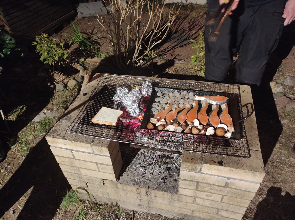 Als dann das Feuer etwas runtergebrannt war, ging es ans Grillen. Wir hatten gut eingekauft : Fleisch, Würstchen, Garnelen und natürlich Fisch. Ok, ein bisschen Gemüse war auch dabei….
